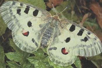 Бабочка аполлон (Parnassius apollo), к сожалению, сейчас встречается не так часто, наибольшие популяции сохранились в Европе в горных долинах (до высоты 2200 м) от Испании до юга Скандинавского полуострова, на востоке — до Средней Азии. Это связано с ухудшением экологической обстановки в Европе и в мире в целом, в результате чего гибнут растения, которыми питаются гусеницы аполлона. Эта бабочка имеет белые передние крылья, по краям прозрачные, как стекло, с черными пятнами; задние крылья белые, с двумя красными и белой серединой глазками. Размах крыльев у аполлона достигает 7—9 см.