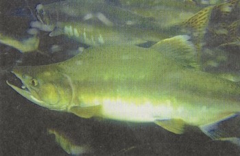 Кижуч, получивший за свою ярко-серебристую окраску чешуи названия "серебряный лосось" и "белая рыба"; спина и верхние лучи хвостового плавника покрыты темными пятнышками. Взрослая особь достигает длины 84 см, средний же размер — 60 см. Во время нереста самцы и самки становятся темно-малиновыми.
