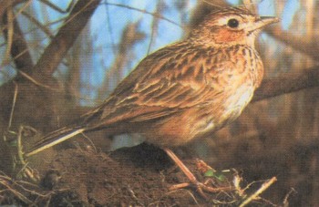 | Величина | Длина тела 18 см | Признаки | Оперение ржаво-буроватое, на голове и груди темные пятнышки; на голове чуть заметный хохолок; довольно длинный хвост с белыми рулевыми перьями; в начале брачного периода слышны песни самца |