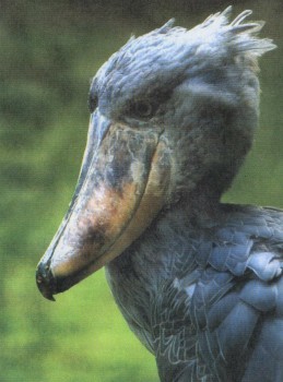 | Величина | Длина тела 1,5 м | Признаки | Огромный, туфлевидный клюв; на голове хохол из коротких перьев; окраска тела однотонная серая |