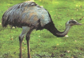 | Величина | Длина тела 1,5 м; высота 1,7 м; размах крыльев до 2,5 м; масса 20—25 кг и больше | Признаки | Похож на страуса, мощные, приспособленные для бега ноги, неспособные к полету крылья; длинная шея, маленькая голова с крупными глазами; оперение самца серовато-бурое, на голове, у основания шеи и на груди перья черные; самка мельче, и у нее меньше черных перьев; молодые птицы поначалу желтоватые с черными продольными полосами |