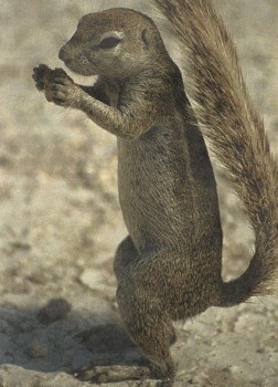 Земляная белка живет в Южной Африке. Для защиты от дневных палящих лучей солнца этих зверьков спасает "зонтик": длинный пушистый высоко поднятый хвост создает необходимую тень.