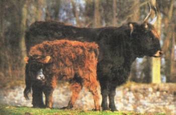 | Величина | Длина тела до 3,1 м, масса 800—1000 кг; быки крупнее и тяжелее коров | Признаки | Голова высоко посаженная, на мощной шее; линия спины прямая; рога светлые и длинные с черными кончиками; шерсть короткая, гладкая: быки матово-черные с узким белым ремнем вдоль спины и светлой челкой на лбу; коровы гнедые, рыжевато-бурые; телята рыжеватые |