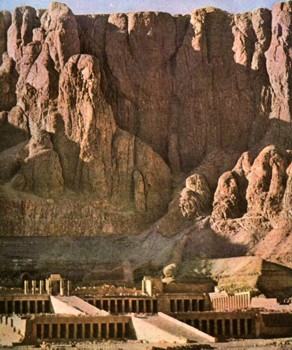 Очень интересен и храм царицы Хатшепсут (начало XV в. до н. э.), тоже сооруженный в Фивах, на западном берегу Нила, на отрогах гор, окружавших столицу. Колоннады храма, расположенного на трех поднимающихся друг над другом уступах, гармонировали с вертикальными выступами скал, служивших ему естественным фоном. В храме было много скульптурных изображений царицы. Стены храма были покрыты цветными рельефами, изображавшими то богов, то события, происходившие в период царствования Хатшепсут. Замечательны рельефы, на которых показана далекая страна Пунт, откуда египтяне привозили ценные благовония.