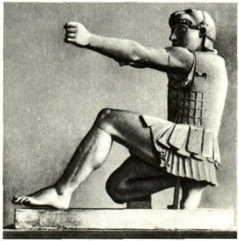 К концу VI в. до н. э. был достигнут определенный успех в этом отношении. Сражающиеся воины на фронтоне храма Афины Афайи на острове Эгина (ок. 500 до н. э.) представлены в стремительном движении, они нападают или обороняются («Нападающий воин», Музей античной скульптуры, Мюнхен). Правда, свойственные более ранним скульптурам скованность и застылость еще не преодолены в них полностью.
