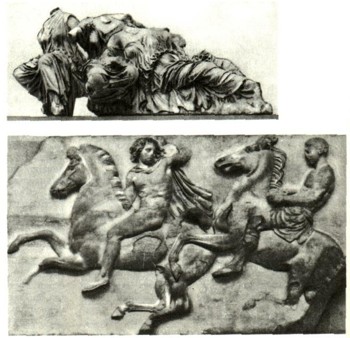 Круг Фидия. Скульптура восточного фронтона Парфенона. Всадники. Рельефы Парфенона. V в. до н. э. Мрамор. Британский музей. Лондон (внизу).