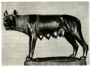 Умели этруски делать большие статуи из глины, камня или бронзы. Многому этрусские мастера научились у греков, с которыми они рано завязали торговые отношения. В VI — V вв. до н. э. этруски были гораздо более развитым и культурным народом, чем римляне. Не удивительно, что именно их пригласили римляне для строительства первых своих храмов. Этруски делали и скульптуры для этих храмов, и статуи, украсившие Рим. Лишь одна из них дошла до нас — знаменитая статуя Капитолийской волчицы, кормящей Ромула и Рема (фигурки братьев-близнецов, легендарных основателей Рима, сделаны заново в XVII в. — старые не сохранились). Это творение неизвестного этрусского скульптора украшало некогда площадь города и стало символом Рима.