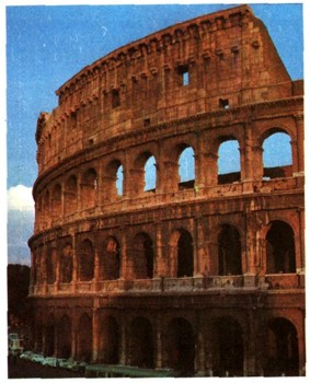Колизей (75 — 80 н. э.), или, как его называли сами римляне, Колоссей (громадный), — гигантский амфитеатр в форме овальной чаши. Некогда на трибунах Колизея располагалось около 50 тыс. зрителей, приходивших сюда смотреть бои гладиаторов. Этот предок наших стадионов имел арену, которую можно было заливать водой и превращать в бассейн.