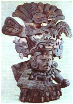 Той же строгостью и некоторым схематизмом поражает скульптура ацтеков. Они создавали грандиозные культовые статуи, иногда очень отдаленно напоминающие человеческую фигуру и целиком составленные из разных символических изображений: кукурузных початков, клыков и когтей животных, человеческих черепов и т. д. Таковы, например, статуи богини земли и плодородия Коатликуэ, бога весны и т. д.