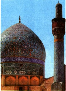 Купол и минарет медресе Мадери-Шах, украшенные расписными изразцами. Начало XVIII в. Исфахан. Иран.