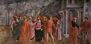 Мазаччо. Сбор подати. Сцена из жизни св. Петра. 1426 — 1427. Фреска капеллы Бранкаччи. Флоренция.