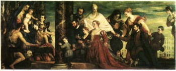 П. Веронезе. Семья Куччина, поклоняющаяся мадонне и святым. 1571. Холст, масло. Картинная галерея. Дрезден.