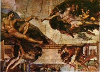 В 1508 г. папа Юлий II дал Микеланджело заказ — сделать роспись потолка Сикстинской капеллы в Ватикане. Размеры будущей росписи превышали 600 м2. В невероятно трудных условиях, лежа на спине на высоких лесах, художник сам, без помощников, воссоздал в огромной фреске на потолке капеллы библейскую легенду, повествующую о событиях от сотворения мира до потопа. Один из ярких образов этой росписи — первый человек Адам. Мужественный и прекрасный, с еще неразбуженной мыслью и нераскрывшимися силами, лежит он на склоне холма, протянув руку к создавшему его богу. Через плечо бога смотрит ангел, изумленный красотой человека. Роспись потолка Сикстинской капеллы — образец понимания синтеза живописи и архитектуры в эпоху Возрождения.