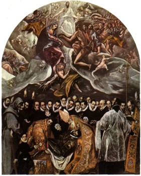 Своеобразное искусство Греко не понравилось королю, и художник уехал в Толедо и поселился там навсегда. В Толедо были созданы лучшие произведения Греко. Среди них — «Погребение графа Оргаса» (1586 — 1588, церковь Санто-Томе, Толедо). Картина разделена на две части: землю и небо. Внизу, на переднем плане, святые Августин и Стефан в одеждах, горящих золотом, опускают тело графа в гробницу. За ними стоят двадцать два знатных дворянина, среди них ученые и поэты Толедо. Все они в черных одеждах. Их лица бледны, глаза одних подняты к небу, других — скромно опущены; фигуры озарены колеблющимся пламенем факелов. Напротив, в верхней части, где изображены Христос, мадонна и святые, все в движении.