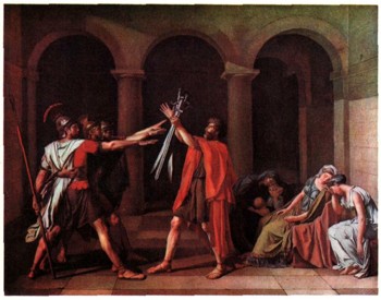 В те годы, когда в Испании жил и творил Гойя, во Франции работал его великий современник Жак Луи Давид (1748 — 1825). Этот живописец тоже был связан с передовыми идеями и революционной борьбой масс, но созданные им образы мало чем напоминают творения Гойи. Поклонник античного искусства, с которым он познакомился во время поездки в Италию, Давид на всю жизнь сохранил пристрастие к чеканному рисунку, строгой, спокойной композиции. Эти черты его стиля в полную меру раскрылись в картине «Клятва Горациев» (1784, Лувр, Париж). Сюжет картины связан с римской историей. Перед отправлением в бой братья Горации произносят клятву верности родине. Действие происходит как бы на сценической площадке, ограниченной сзади тремя арками. На фоне каждой из них отчетливо вырисовываются фигуры героев: слева — три брата Горация, в центре — благословляющий их старик отец, справа — сестра Камилла и служанки. Звучные пятна цвета, среди которых преобладают красные и синие, всецело подчинены рисунку. Хотя картина и была написана на сюжет, далекий от французской действительности, она воспринималась современниками как непосредственный призыв к действию, к борьбе за революционные идеалы. Картина воспитывала во французских гражданах мужество и верность отчизне, столь необходимые в преддверии революции.