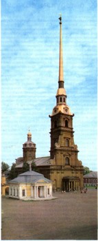 Город был основан в мае 1703 г., когда заложили крепость, названную Санкт-Петербургом. А через месяц, в июне, в день церковного праздника апостолов Петра и Павла, началось строительство Петропавловского собора. Вначале колокольня и собор были деревянными, а впоследствии, когда в 1712 г. Петербург был официально объявлен столицей государства, перестроены в каменные (1712 — 1733). Создатель этих сооружений — Доменико Трезини (ок. 1670 — 1734). Петропавловская крепость и собор стали фактическим центром города. Крепостные стены с мощными бастионами, выходившими к воде, имели грозный вид и свидетельствовали о могуществе государства. Главное сооружение Петропавловской крепости — собор и его колокольня, которая вместе со шпилем достигает 122,5 м. Колокольня и до сих пор остается самой высокой точкой Ленинграда. На конце ее шпиля крест, вокруг него вращается флюгер — фигура ангела, размах крыльев которого достигает 3 м 80 см.