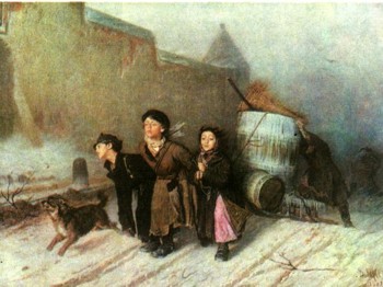 В. Г. Перов. «Тройка». Ученики мастеровые везут воду. 1886. Холст, масло. Государственная Третьяковская галерея. Москва. ...Холодный зимний вечер. Метет. Редкие прохожие спешат укрыться от непогоды. И только трое оборванных ребятишек тянут по неровным московским улицам салазки с огромной бочкой, наполненной водой, настоящая «тройка» с коренным в центре и пристяжными по бокам. Резкий ветер треплет ребячьи лохмотья: старые платки, шарфики, рваные полушубки, — но ребята словно бы и не замечают этого пронзительного ветра и холода: усталость от непосильного труда поглощает все их ощущения. В бледных измученных лицах детей нет и тени веселой беспечности, и не радует их визг и лай бегущей рядом собаки, единственного друга этих обездоленных, лишенных детства ребятишек.