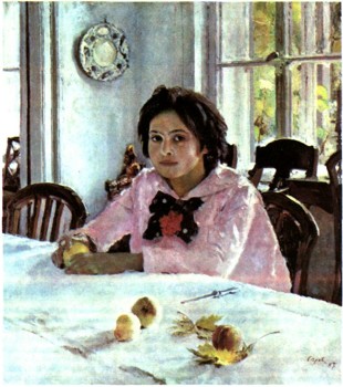 На двадцать втором году своей жизни Серов создал первый шедевр — «Девочку с персиками» — портрет Веры Мамонтовой (1887, ГТГ). В этом подростке с серьезным, почти взрослым взглядом кроется поэзия светлой юности, угадываются высокие идеалы. Поэтична вся картина с ее напоенными воздухом и светом чистыми красками, в свое время так поразившими современников. В 1888 г. Серов пишет картину «Девушка, освещенная солнцем» (ГТГ) — портрет Маши Симанович. В нем поражает то же чувство благородства человека и полноты жизни, которое привлекает нас в «Девочке с персиками».