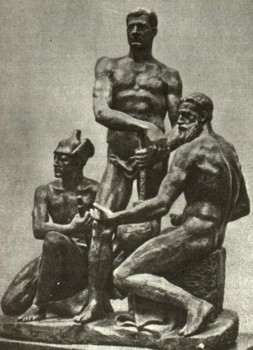 После революции произошло подлинное возрождение и монументальной скульптуры, чему способствовал, как мы уже говорили, ленинский план монументальной пропаганды. В области скульптуры, предназначенной для площадей и улиц и обладающей глубоким общественным содержанием, работали помимо уже упоминавшихся нами Андреева и Шадра немало и других талантливых ваятелей. Почетное место среди них принадлежит А. Т. Матвееву (1878 — 1960), создавшему к 10-летию Октябрьской революции исполненную подлинного величия композицию «Октябрь» (1927, ГРМ). Художник изобразил трех представителей победившего народа — рабочего, крестьянина и красноармейца. Матвеев много работал и в области станковой скульптуры.