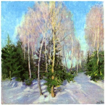 Искрится на солнце ослепительный снег («Сентябрьский снег», 1903), протянулись от обнаженных деревьев сине-голубые тени («Мартовский снег», 1904), розовым жемчугом переливается иней, застывший на ветках («Февральская лазурь», 1904), радует золотой убор осенних лесов с ярко-красной рябиной («Рябинка», 1915; все в ГТГ).