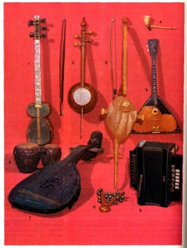 Музыкальные инструменты народов СССР. 1 — тар закавказский; 2 — гиджак среднеазиатский ; 3 — пыйспиль эстонский; 4 — жалейка русская; 5 — балалайка русская; 6 — диплипито грузинская ; 7 — бандура украинская; 8 — ложки с бубенцами русские; 9 — гармошка саратовская.