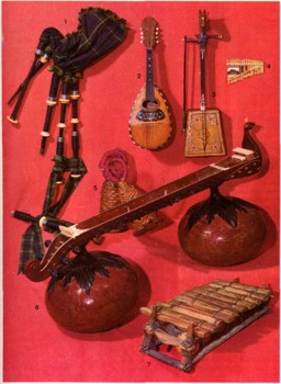 Народные музыкальные инструменты разных стран. 1 — волынка шотландская; 2 — мандолина итальянская; 3 — моринхур монгольский со смычком; 4 — флейта многоствольная латиноамериканская; 5 — ча-ча кубинская; 6 — вина индийская; 7 — балафон гвинейский.