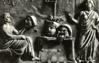 Актер древнеримского театра выбирает маску. Античный барельеф.