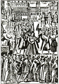 Представление комедии дель арте в Венеции на площади св. Марка. Гравюра