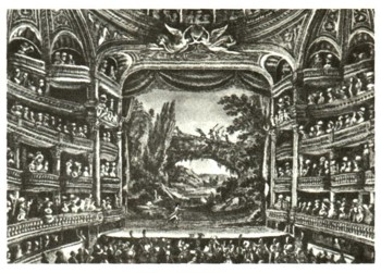 ...Перед сценой на паркетном полу стоят отгороженные от зала перильцами стулья и пюпитры для музыкантов, затем еще три ряда кресел, а потом паркет обрывается — и на простом дощатом полу нет ни скамей, ни стульев. Пусты и семь широких ступеней амфитеатра — простолюдинам, заполняющим партер и амфитеатр, не положено сидеть в присутствии важных господ, разместившихся в ложах и «на паркете». Сцену можно видеть всю — она без занавеса, у нее есть кулисы, но не видно никаких декораций. Кончается сцена рисованным задником.