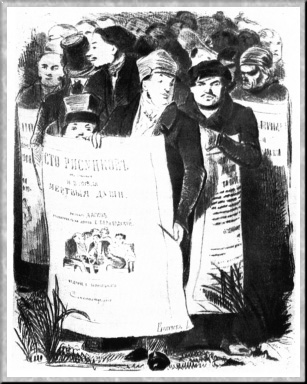 Призванием Агина оказалось иллюстрирование современной ему русской литературы, преимущественно сатирической. В середине 1840-х гг. он проиллюстрировал повесть "Злой человек" Е. П. Гребенки, очерк "Петербургский фельетонист" И. И. Панаева, поэму "Помещик" И. С. Тургенева. Эта работа сблизила его с художником-гравером Е. Е. Бернардским, который для печати отлично переводил его рисунки в гравюры на дереве. Вместе они создали первые иллюстрации к "Мертвым душам" Н. В. Гоголя. По их замыслу 100 больших и 100 малых рисунков должны были сопровождать второе издание поэмы, но автор неожиданно отказал в ее переиздании, и пришлось ограничиться только 100 большими иллюстрациями и издавать их без текста, отдельными выпусками, по 4 рисунка в каждом. Так, в конце 1846-го и начале 1847 г. вышли в свет 72 иллюстрации (а все 100 - только в 1892 г.). Они имели немалый успех и до сих пор остаются лучшими из всех попыток проиллюстрировать поэму. Их сила и обаяние - в ярких типах, очерченных гротескно, но не теряющих жизненности. Социальная заостренность психологических и бытовых характеристик, пластическая ясность и цельность композиции придают образам, созданным художником, значительную широту обобщения и обличительную силу.