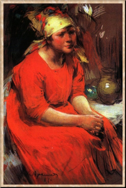В 1920-х гг. основное место в творчестве художника занимают крестьянские портреты-типы: "Крестьянин Рязанской губернии" (1925), "Девушка с кувшином" (1927), "Крестьянка в зеленом фартуке" (1927). В этих портретах нашла продолжение традиция, сложившаяся в творчестве живописца еще в предреволюционные годы: крестьяне изображаются им как сильные, уверенные, жизнерадостные, красивые люди. Но теперь их внутренняя значительность и спокойная величавость возрастают, образы приобретают обобщенность, даже монументальность. Широкий густой мазок, контрастное сопоставление тонов, праздничная яркость цвета - все это создает образы людей, полных здоровья и радости, придает им жизнеутверждающую силу.