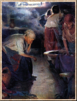 В 1896 г. на XXIV передвижной выставке появились две близкие по теме картины: "Смена. Углекопы" Н. А. Касаткина и "Поденщицы на чугунолитейном заводе" А. Е. Архипова. Оба живописца, каждый по-своему, откликнулись на происходивший в эти годы процесс пролетаризации крестьянства, связанный с развитием промышленности. Так вошла в творчество Архипова социальная тема, которая получила глубокое и законченное воплощение в известной его картине "Прачки" (первый вариант - конец 1890-х гг., второй вариант- 1901). Замысел этой, может быть, наиболее значительной картины мастера возник после посещения им прачечных близ Смоленского рынка в Москве. Здесь, по воспоминаниям самого художника, он "увидел старую женщину... устала она ужасно, спина болит, села отдохнуть... Все живописно - пар клубится, усталость старухи...". Этот образ измученной постоянным изнурительным трудом женщины придает особую выразительность второму варианту картины.