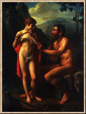 Романтическая стилистика ощутима и в самой известной, наиболее значительной картине Басина, написанной на сюжет из античной истории, - "Сократ в битве при Потидее защищает Алкивиада" (1826-28). Картина эта после успешного показа в Риме была отправлена в Петербург на корабле. В пути судно потерпело крушение, и холст оказался сильно испорченным. Вернувшись в Россию, Басин в начале 1830-х гг. основательно подправил картину, а затем подарил ее АХ (ныне в ГРМ).