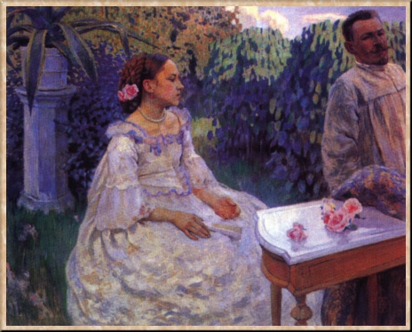 Вернувшись в Саратов, Борисов-Мусатов написал картину "Автопортрет с сестрой" (1898), в которой впервые обнаружилось его стремление представить реальный мир как напоминание об ином, нереальном и прекрасном мире прошлого, выразилась склонность к декоративизму, превращающему картину в подобие панно, и даже любовь к характерному сине-зеленому колориту.