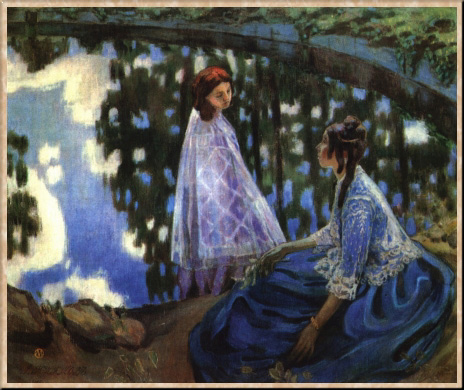 Еще в 1899 г. Борисов-Мусатов стал членом МТХ и вскоре, несмотря на слабое здоровье и на то, что жил не в Москве, оказался одним из его лидеров: он энергично занимался устройством выставок в Москве и Петербурге и заметно влиял на художественные позиции объединения. Картина "Водоем", показанная на одной из выставок МТХ, имела громадный успех и принесла популярность ее автору, до того ценимому только в узком кругу коллег и знатоков. В 1903 г. художник покинул Саратов и перебрался в Подольск, чтобы быть ближе к московской художественной жизни. Он тесно сошелся с литераторами-символистами, сплотившимися вокруг журнала "Весы" и воспринявшими Борисова-Мусатова как единомышленника - символиста в живописи. Многие молодые художники, в том числе П. В. Кузнецов, М. С. Сарьян, Н. Н. Сапунов, Н. С. Уткин, А. Т. Матвеев, видели в нем своего идейного вождя. В начале 1904 г. работы Борисова-Мусатова были показаны в нескольких городах Германии, потом в Париже и вызвали восторженные отклики критиков. К сожалению, это высокое признание, как на родине, так и за ее пределами, ничего не меняло в существовании художника, жившего с женой и ребенком довольно бедно: коллекционеры его работ почти не покупали, и даже Третьяковская галерея, уступая настойчивости В. А. Серова, приобрела у него лишь однажды картину и два эскиза.