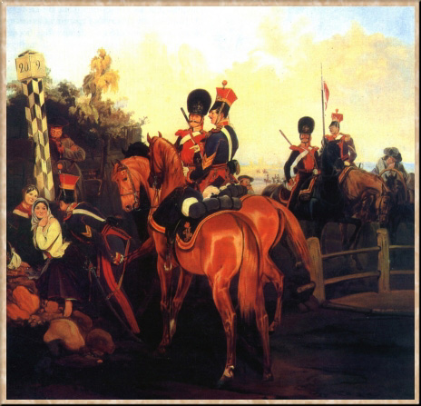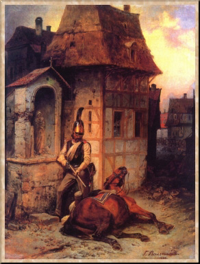 Б. П. Виллевальде, получивший художественное образование в Петербургской АХ (1838-42), своим поприщем избрал батальный жанр - очень почетный в эпоху Николая I. Навыки живописи такого рода он усвоил у своего учителя, А. И. Зауервейда. Всю жизнь Виллевальде писал эффектные большие картины, посвященные историческим победам русского оружия, а также официальным событиям - торжественному открытию памятника "Тысячелетие России" в Новгороде или въезду императора Александра II в Москву для коронации. Все же ему удалось и слегка подновить батальный жанр. Он гораздо чаще, чем было принято до тех пор, обращался к современности или самой близкой истории; так, он не раз запечатлевал события трудно и долго тянувшейся кавказской войны (1817-64). Следуя общей тенденции своего времени и, очевидно, собственной склонности к бытовому реализму, художник старался по мере сил преодолевать помпезность и парадность. Он часто выезжал на места боевых действий, набираясь впечатлений, необходимых для правдивого изображения реальности. От широких картин сражений Виллевальде довольно охотно переходил к воссозданию мелких, частных эпизодов, позволяющих пристальнее вглядываться в происходящее ("Эпизод из русско-венгерской войны", 1872; "Сражение при Быстрице", 1881; "Батальный этюд", "Голова военного", обе 1880-е, и др.). В последние два десятилетия жизни Виллевальде фактически преступил границу батального жанра в серии небольших полотен, посвященных походу русской армии в Западную Европу в 1813-15 гг.; здесь он с сочувствием и порой с незатейливым юмором живописал взаимоотношения, складывавшиеся между русскими солдатами и местными жителями.