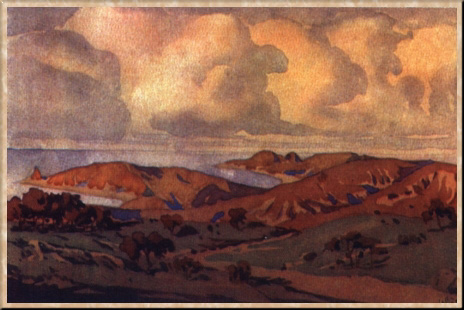 Каждая акварель Волошина - а он часто дарил их своим друзьям и даже не очень близким людям - несет частицу света, мудрости и любви. Создавая их на протяжении многих лет, художник размышлял о соотношении четырех стихий: Земля, Вода, Воздух и Огонь (Солнце, звезды), о глубинном смысле Космоса. Почти каждый реальный или фантастический пейзаж увиден как бы с точки зрения Творца, поэтому стихии в акварелях Волошина - море, холмы, небо, облака, - сохраняя свою плотность и "фактуру", светопроницаемы и светоносны ("Два дерева в долине. Коктебель", "Пейзаж с озером и горами", оба 1921; "Розовые сумерки", "Холмы, иссушенные зноем", оба 1925; "Лунный вихрь", "Свинцовый свет", оба 1926, и др.).