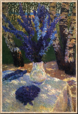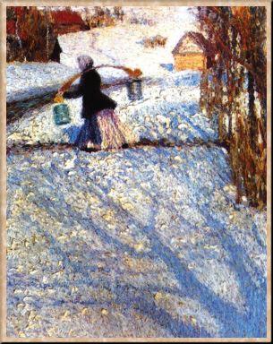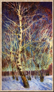 В 1900 г. Грабарь возвращается в Россию, и тут начинается, по признанию художника, самый его "творческий период". Он вновь после долгой разлуки влюбляется в русскую природу, ошеломлен красотой русской зимы, без конца пишет "сверхъестественное дерево, дерево-сказку" - березу. В Подмосковье созданы наиболее известные его произведения: "Сентябрьский снег" (1903), "Белая зима. Грачиные гнезда", "Февральская лазурь", "Мартовский снег" (все 1904), "Хризантемы" (1905), "Неприбранный стол" (1907) и др. Грабарь пишет на открытом воздухе, учитывая достижения французских импрессионистов, но, не желая слепо им подражать, пишет по-русски, любя "вещественность и реальность". "Февральская лазурь" - это величественный "портрет" березы. Мы смотрим на нее снизу вверх, из глубокой траншеи в снегу, которую вырыл автор и в которой он работал, невзирая на жестокие морозы, переполненный радостью от "перезвонов и перекликаний всех цветов радуги, объединенных голубой эмалью неба". Пейзаж написан чистыми цветами, мазки положены плотным слоем. "Мартовский снег" - "ярко импрессионистическую вещь по замыслу и фактуре" - художник тоже писал на пленэре "с таким увлечением и азартом, что швырял краски на холст, как в исступлении, не слишком раздумывая и взвешивая, стараясь только передать ослепительное впечатление этой жизнерадостной мажорной фанфары". В этих произведениях Грабарю удалось создать еще один, новый (после русских пейзажистов XIX столетия), обобщенный образ русской природы.