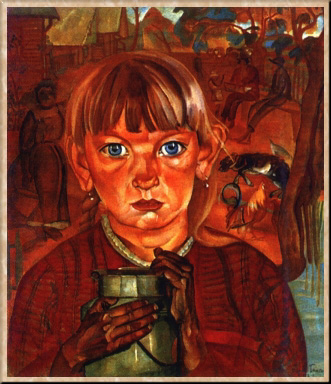 В 1917-18 гг. Григорьев создает цикл "Ра-сея", где сама тема русской деревни в послереволюционной России обнаружила в Григорьеве художника мыслящего, однако мыслящего "глубоко и разрушительно" (А. А. Блок). Все рисунки и картины маслом этого цикла выполнены в окрестностях Петрограда и Олонецкой губернии. Как и в парижской серии, образы людей - крестьян, детей, стариков - создаются виртуозными линиями, которые придают композициям красоту и притягательность, но они же, будучи предельно правдивыми в гротескной беспощадности, сообщают формам почти циничную деконструктивность. Художник любил разнообразные формы и явления жизни, которые препарировал красивой графической линией, заставляя натуру насыщать своей силой "шедеврики" (выражение Григорьева) художника. Крестьяне на картинах "Деревня", "Земля народная", "Олонецкий дед", "Старуха с коровой", "Девочка с бидоном" в упор глядят на зрителя из давящего пространства композиций. В их глазах немой вопрос, упрек и даже угроза. Это галерея типов русской деревни, как ее понимала большая часть столичной артистической интеллигенции, к которой принадлежал художник и для которой новый цикл явился откровением. театр, - и монументальный, и гротескный, и реальный, и условный.
