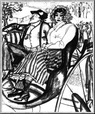Известность в России пришла к Григорьеву после участия (начиная с 1913 г.) в выставках объединения "Мир искусства", на которых экспонировались его рисунки, сделанные во время кратковременных поездок в Париж в 1911 и 1913 гг. Творческий и праздничный дух этого города вдохновил его на создание нескольких тысяч рисунков, на ежедневный исступленный труд, когда время отмечается только стирающимися карандашами, а каждый шаг приносит новый сюжет. Консьержки, клоунессы, гарсоны, обыватели - вереница типажей непарадного Парижа создает в этих листах законченный в своем роде образ города, увиденного под определенным углом зрения. "Intimite" ("интимность", франц.) - так назвал художник большую серию парижских рисунков. Созданные как бы на одном дыхании, они научили руку художника беспрекословно подчиняться его чувственному ощущению, получаемому от натуры.