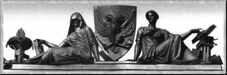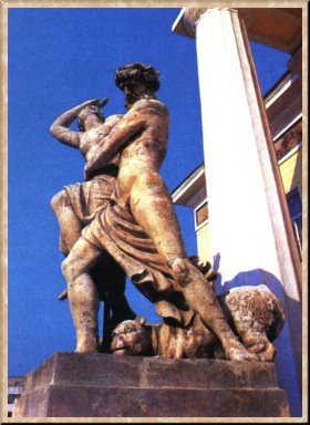 Владыка богатств подземного царства Плутон, похитивший дочь Зевса Прозерпину, силой увлекает ее к себе в Аид, вход в который символизирует трехглавый пес Цербер у основания группы. Широкий, могучий шаг Плутона, его напряженная фигура, мощные руки, держащие сопротивляющуюся девушку, сосредоточенное лицо - все выражает уверенность и волю, которые нажей был обусловлен темой всего сооружения: земля и ее недра. Идейным центром архитектурно-пластической композиции являются две двухфигурные группы, фланкирующие широкий лестничный спуск и располагающиеся на фоне мощной колоннады дорического портика. Одну из групп - "Геракл и Антей" - выполнил Пименов, другую - "Похищение Прозерпины Плутоном" - Демут-Малиновский (обе 1809-11).