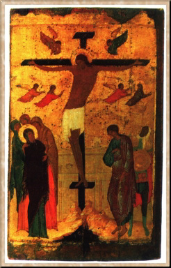 Много работ выполнил Дионисий для Ио-сифо-Волоколамского и Павло-Обнорского монастырей. В частности, для последнего он написал "Распятие", которое помещалось в иконостасе собора. Центр иконной доски, подчеркивая ее вертикаль, занимало изображение креста, на котором распят Спаситель. Поникшая голова, словно венчик увядшего цветка, раскинутые, как стебли, руки и пластично изогнутое тело создают торжественно-печальное настроение. Безмолвно застывшие фигуры предстоящих - Марии, Иоанна и пришедших с ними женщин и воина - составляют симметрично расположенные по сторонам креста скорбные группы. Им вторят фигуры ангелов в верхнем регистре и помещенные еще выше, над перекладиной креста, изображения Солнца и Луны, символизирующие космическое значение события. Ангелы, следящие за бегом небесных светил, уводят их с небосклона.