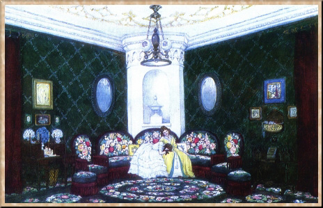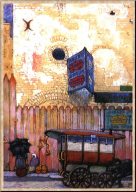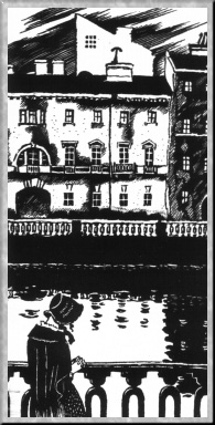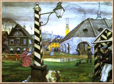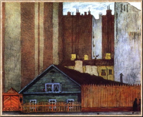 М. В. Добужинский был сыном артиллерийского офицера, потомка обрусевшего старинного литовского рода. После первого курса юридического факультета Петербургского университета Добужинский попытался было поступить в АХ, но не был принят и занимался в частных студиях до 1899 г., когда, закончив университет, поехал за границу и продолжил художественные занятия в студиях Мюнхена. Вернувшись в 1901 г. в Петербург, он сблизился с объединением "Мир искусства" и вошел в число самых заметных его представителей. Дебютировал Добужинский в графике - рисунками в журналах и книгах, городскими пейзажами, в которых сумел впечатляюще передать свое восприятие Петербурга как города, где величественная классическая архитектура фантасмагорически соединяется с уродливыми реалиями урбанизма XX в. Тема города сразу сделалась одной из главных в его творчестве, он обращался к ней в пейзажных циклах, создаваемых по следам частых поездок по России и за границу; городской пейзаж оказывается важным компонентом многих его произведений.