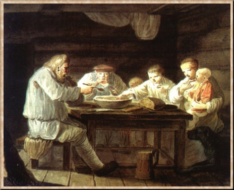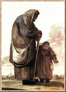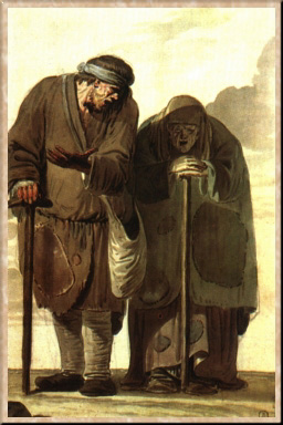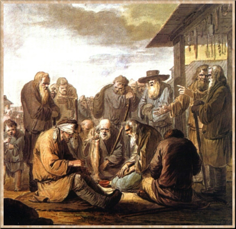 Однако самой значительной работой художника, обеспечившей ему почетное место в истории русского искусства, стала серия из 8 акварелей "Нищие". Относительно ее датировки у специалистов нет однозначного мнения. По-видимому, все же серия выполнена в период от середины 1760-х до 1775 г., то есть до отъезда художника в Париж. Шесть листов изображают одетых в лохмотья слепых стариков и старух, иногда в сопровождении ребенка-поводыря. Сильное впечатление производят эти лишенные индивидуальных черт, застывшие, как трагические изваяния, фигуры, монументально возвышающиеся на фоне низкого горизонта. Две другие акварели - "Поющие слепцы" и особенно "Крестьяне за обедом" - отличает жанровое решение темы, сближающее их с работами современника Ерменева - живописца М. Шибанова. Однако никому из русских художников ни до ни после Ерменева не удалось показать человеческие страдания в эпическом измерении, наполнить их воистину библейским смыслом, как это сделал он.