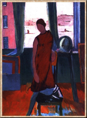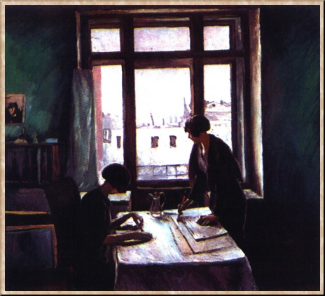Уютная комната с большим квадратным окном в темно-зеленой стене, за ним - розово-жемчужный (по контрасту с глубоким, сильным цветом внутри) зимний город. Против света - изящные силуэты двух девушек в черном, занятых чтением. Это "Вузовки" (1933), лучшая и наиболее известная картина К. Н. Истомина. На первый взгляд - бытовой жанр, картина на "домашнюю" тему. Но смысл довольно большого, широко и смело написанного холста явно не в подробностях рассказа, не в характерах девушек (о них мы ничего конкретного не узнаем), не в их занятиях. Он в чем-то ином, менее определенном, но более общем... В самом деле, почему эта обыденная по сюжету картина кажется вдруг раскрытым окном в другое, давно ушедшее время, словно бы погружает зрителя в духовную атмосферу 1930-х гг.? Дело, видимо, в самом строе живописи Истомина, в ее точных, но мягких силуэтах, в ее цветовых контрастах.