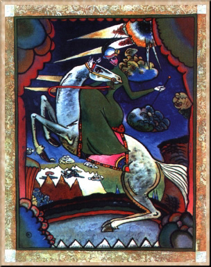 В начале 1900-х гг. Кандинский много путешествовал - побывал в Голландии, Швейцарии, Италии, Франции, приезжал и в Россию, - но постоянно жил в селении Мур-нау, в Баварских Альпах. Работы этих лет, в основном пейзажи, построены на цветовых диссонансах; игра цветовых пятен и линий постепенно вытесняет образы реальной действительности ("Ахтырка. Осень. Этюд", 1901; "Шлюз", 1901; "Старый город", 1902; "Синий всадник", 1903; "Берег залива в Голландии", 1904; "Мурнау. Двор замка", 1908). В эти же годы он обратился к русской сказочной, былинной старине, создав завораживающие образы ("Русский всадник", 1902; "Русская красавица в пейзаже", 1904), превратив в зримое таинственные предания о славянских деревянных городах ("Русская деревня на реке с ладьями", ок. 1902;"К городу",ок.1903).