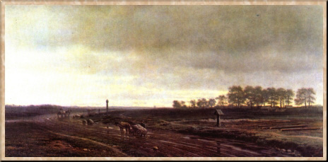 В 1863 г. Клодта прославила картина "Большая дорога осенью". Современники увидели здесь давно ожидаемый типический, неброский российский пейзаж. Небо и равнина. Небо низко нависло над землей тяжелыми дождевыми облаками, земля - сплошная унылая черная хлябь, в которой застряла крестьянская телега без всякой надежды выбраться.