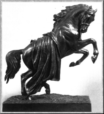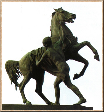 В начале 1833 г. художник начал работу, продолжавшуюся в общей сложности около 20 лет и ставшую поистине главным делом его жизни: это четыре бронзовые конные группы "Укротители коней", украсившие в 1850 г. Аничков мост через реку Фонтанку в Петербурге. Композиция этого уникального ансамбля раскрывается в процессе последовательного обзора. Переходя от группы к группе, зритель как бы читает их одну за другой и постепенно выявляет их сюжетно-смысловые и пластические связи. Весь цикл объединяет тема победы человека над стихийным могуществом природы. В первой группе юноша-возничий, напрягаясь всем телом и крепко схватив узду, сдерживает вздыбленного коня. В следующей группе драматизм борьбы нарастает: в неукротимом порыве вырывается конь, а движения человека становятся все напряженнее, возничему едва удается осадить коня, делая могучее усилие. В третьей группе человек повержен на землю, а коню почти удается вырваться на волю. Наконец, в четвертой группе человек вновь покоряет животное. Пропорциональность, строгая гармоничность, плавная, графически отчетливая линия силуэтов - такова художественная форма групп Клодта. Она хорошо согласуется с архитектурой окружающей части города.