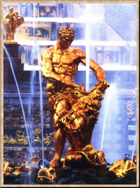 В самом конце XVIII в. лучшие русские ваятели были привлечены к работе над обновлением скульптуры Большого каскада в Петергофе. Роль Козловского особенно значительна: созданная им группа "Самсон, раздирающий пасть льва" занимает центральное место в идейном замысле и композиции этого ансамбля. Еще в петровское время получила распространение в искусстве аллегория, согласно которой библейский Самсон (отождествляющийся со святым Сампсонием, в день празднования памяти которого, 27 июня 1709 г., была одержана победа над шведами под Полтавой) олицетворял победившую Россию, а лев (герб Швеции) - побежденного Карла XII. Козловский использовал эту аллегорию, создав грандиозное произведение, где в единоборстве могучего титана со зверем раскрывается тема морского могущества России. (В годы Великой Отечественной войны статуя была похищена фашистами. В 1947 г. скульптор В. Л. Симонов, при участии Н. В. Михайлова, выполнил по ее образцу новую модель, возвратив таким образом утраченный памятник новым поколениям зрителей.)