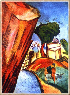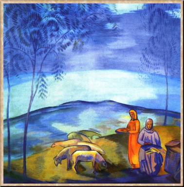 Ко времени окончания МУЖВЗ (1904) символистская ориентация Кузнецова вполне определилась. Особенное значение приобрели живописные открытия Борисова-Мусатова. Однако равновесие отвлеченного и конкретного, которым отмечены лучшие муса-товские вещи, не свойственно символизму Кузнецова. Плоть зримого мира тает в его картинах, его живописные видения почти ирреальны, сотканы из образов-теней, обозначающих едва уловимые движения души. Излюбленный кузнецовский мотив - фонтан; зрелищем круговорота воды художник был заворожен еще в детстве, и теперь воспоминания об этом воскресают на холстах, варьирующих тему вечного круговорота жизни. Как и Мусатов, Кузнецов отдает предпочтение темпере, но использует ее декоративные возможности весьма своеобразно, как бы с оглядкой на приемы импрессионизма. Разбеленные оттенки цвета словно стремятся к слиянию в одно целое: едва окрашенный свет - и картина представляется окутанной цветным туманом ("Утро", "Голубой фонтан", обе 1905; "Рождение", 1906, и др.).